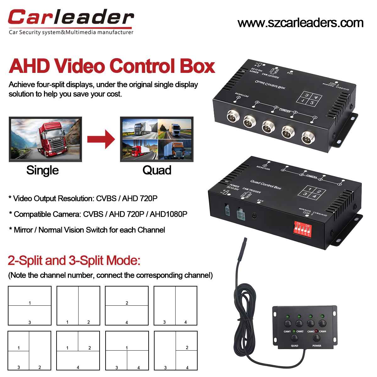 Let’s talk about what you need to know about Carleader AHD Quad View Split Box Video Processer for heavy duty vehicles. AHD quad split control box is an important device for a vehicle CCTV monitoring system. Bus truck video split control box supports turning a single monitor into a quad view monitor, and can connect with 4 AHD car cameras. The following is a detailed explanation of the AHD rearview camera video control box functions, features, and typical use cases.