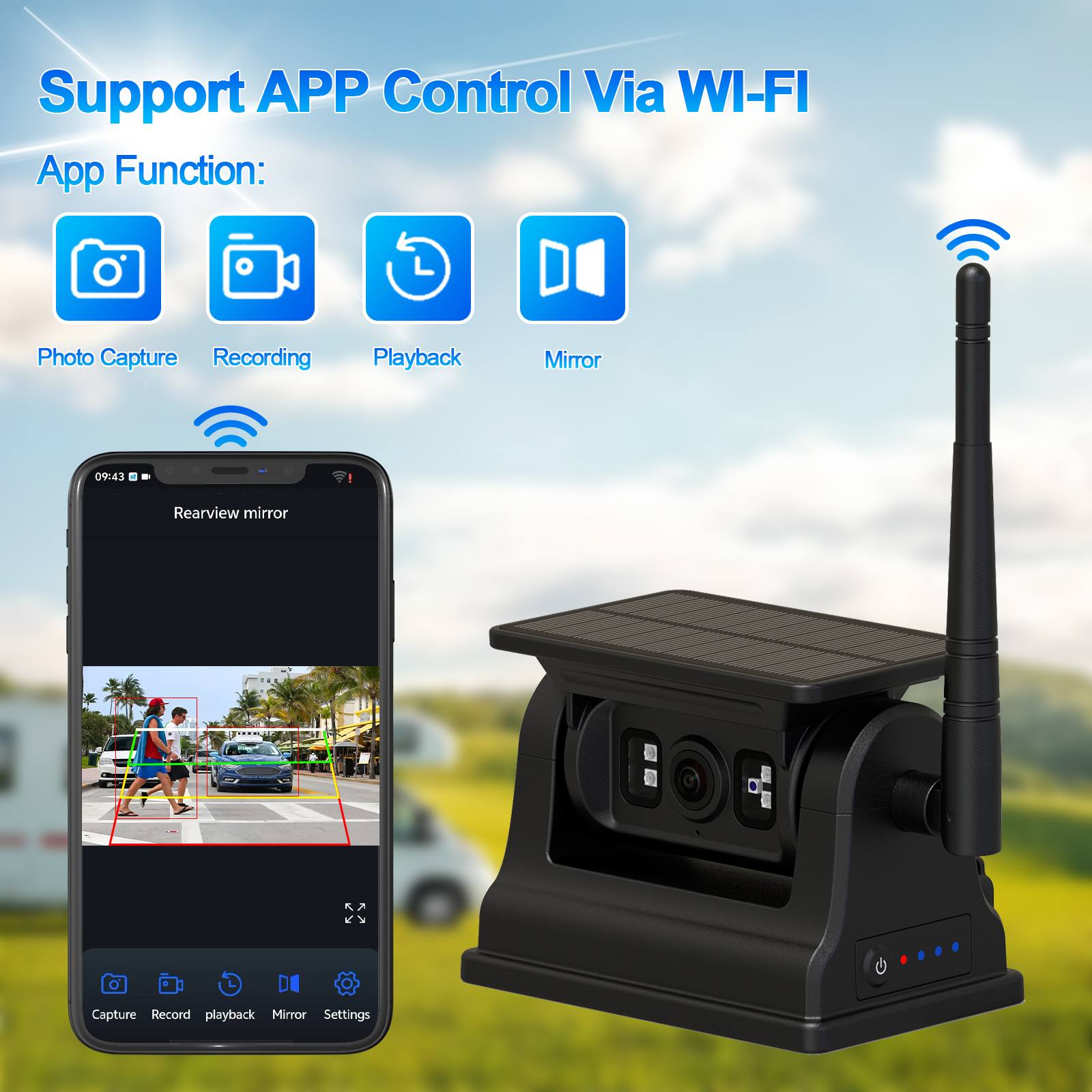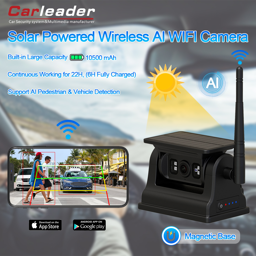 Carleader 1080P Magnetic Solar WiFi Wireless RV Backup Camera For IOS Android, a high-performance Battery Powered WIFI rear view camera designed for modern vehicles, offering seamless connectivity, exceptional clarity, and robust durability. Compatible with both Android and iOS devices, the magnetic base make this camera easy-to-install. It provides a reliable solution for enhancing driving safety and visibility.