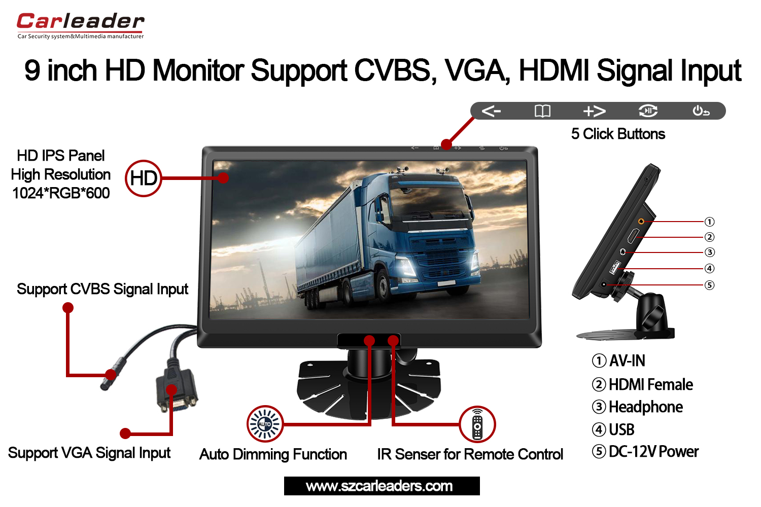 Our Carleader 9 Inch IPS Screen HD Monitor Support CVBS+HD+VGA Inputs has the best video quality and clarity of all our vehicle monitors,and have 5 special click buttons at the top of monitor, 9 Inch IPS Screen Car Monitor Support CVBS,HD,VGA is currently in stock and on sale.