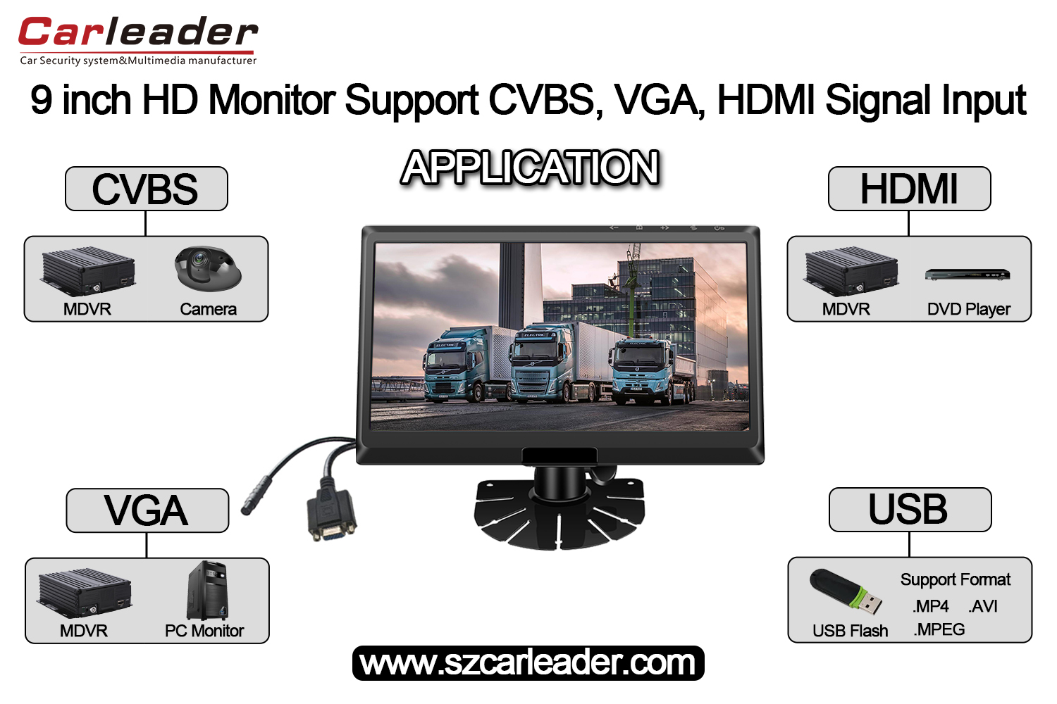 Carleader 9 Inch IPS Screen HD Monitor Support CVBS+HD+VGA Inputs is a high performance HD monitor designed for vehicle monitoring and MDVR fleet management. The Car monitor support CVBS,HD and VGA signal inputs. And if the MDVR has VGA or HD interface,can used with the 9 inch IPS screen car monitor.