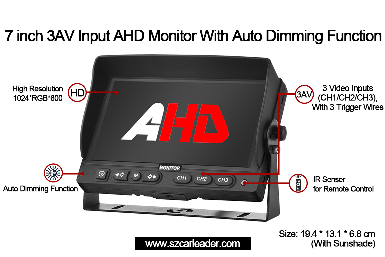 Carleader 7 Inch 3CH AHD Inputs Vehicle Backup Monitor is a robust 7-inch AHD monitor designed for seamless integration into surveillance and automotive systems. Featuring a digital Innolux panel with a 16:9 aspect ratio, it delivers crisp visuals at a resolution of 1024xRGBx600, ensuring clarity for critical applications. Also comes with 3 channel AHD video input to suit most of vehicle vision need.