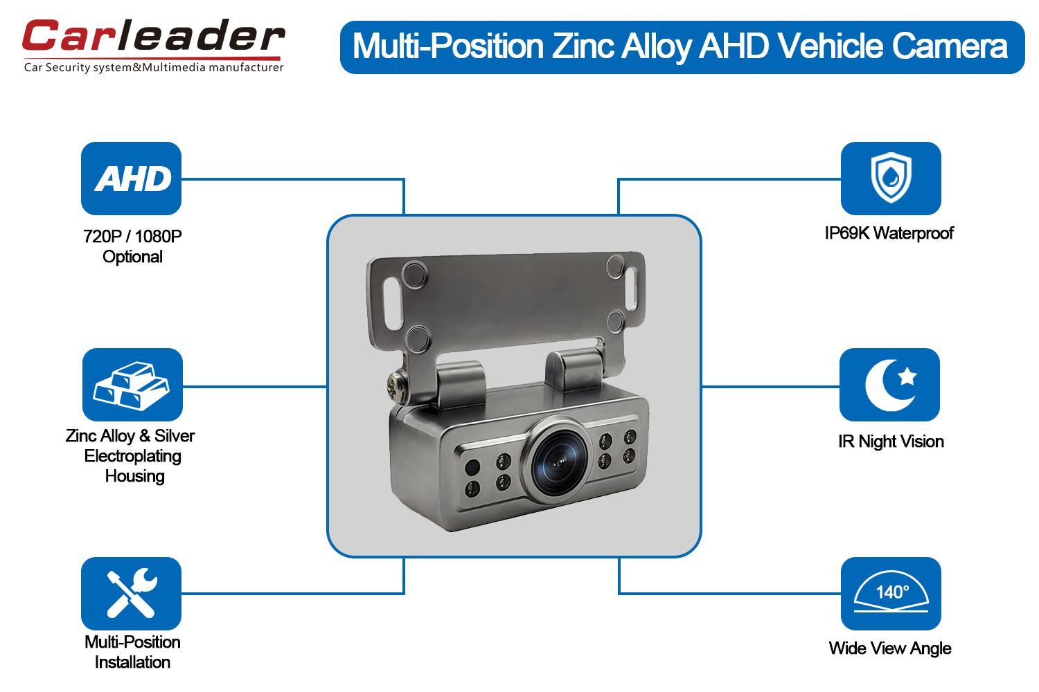 Carleader Multi-Position AHD Silver Electroplating Vehicle Reversing Camera can used as Rear view camera , side camera or front facing mounted cameras. If you are interested in car rear view cameras, especially those made of zinc alloy and with AHD 1080P resolution. The rear view cameras are waterproof and dustproof, with wide viewing angles, and are very suitable for use in the car. They also have night vision functions and parking guides. Do you want to know more about reverse cameras? Please feel free to contact us!